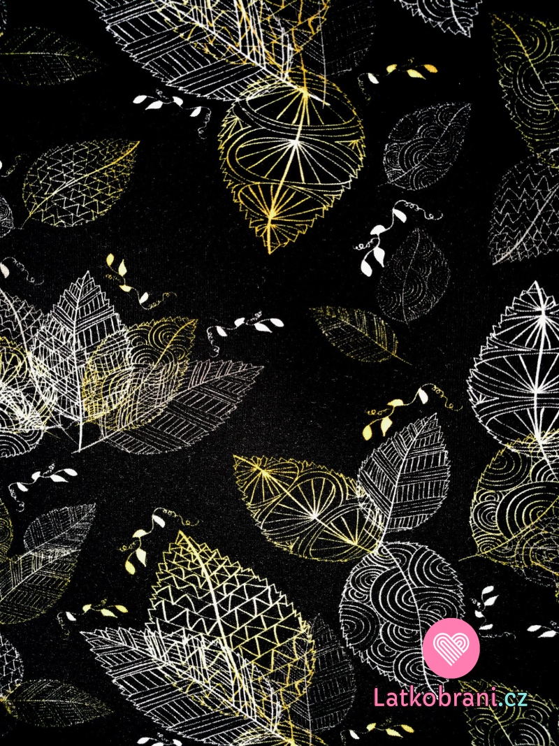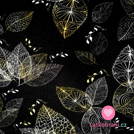 Teplákovina potlač pozlátené obrysy listov na čierne