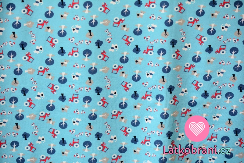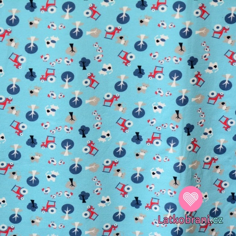 Úplet potlač vidiecky dvoreček - kosačky, zvieratká na stredne modrej