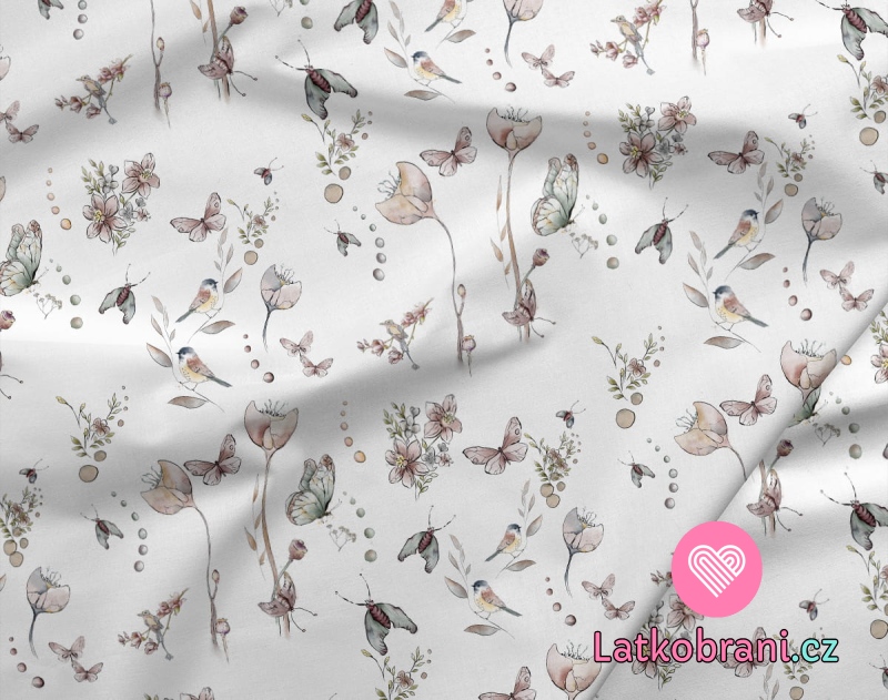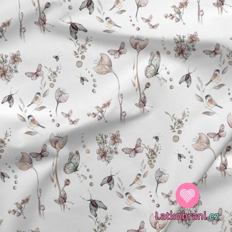 Teplákovina potlač vtáčiky, motýle a mory medzi kvetinami