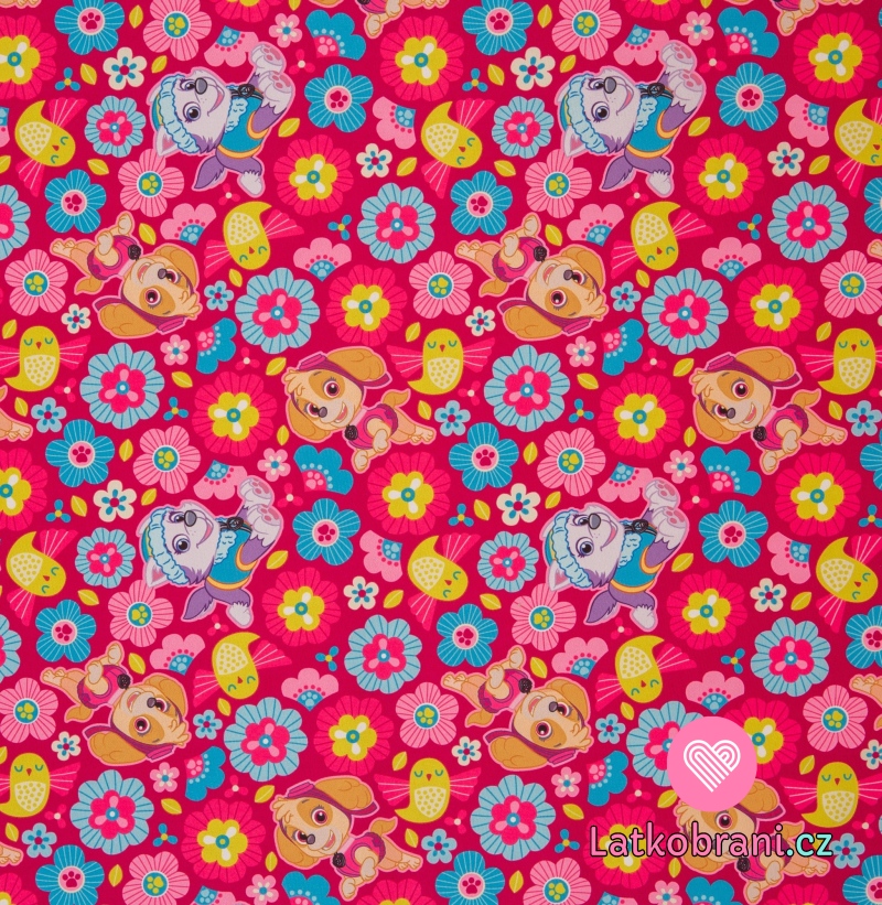 Softshell potlač Tlapková patrola medzi ružovými a modrými kvetmi