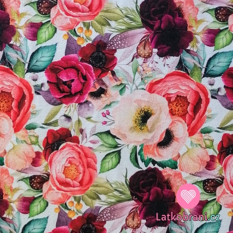 Teplákovina potlač farebné kvety ruží s listami na bielej