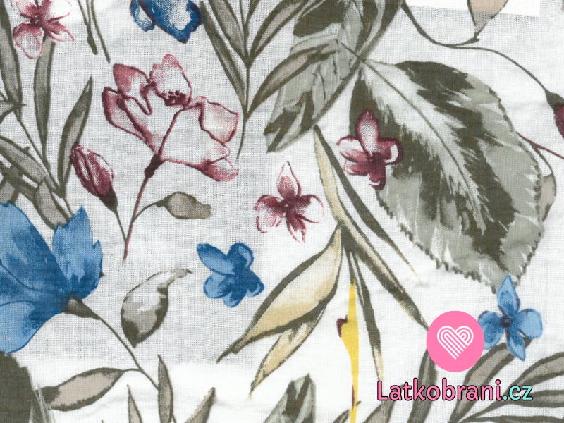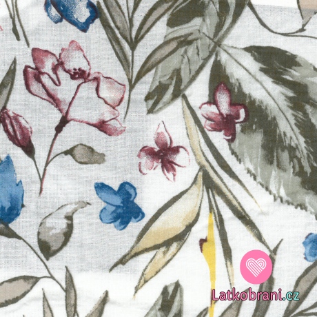 Bavlnená látka s prímesou viskózy maľovaná kvietky s listami