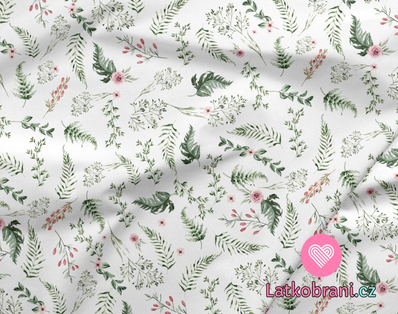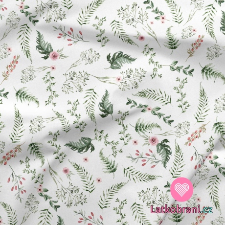 Teplákovina potlač mini šípková ruža s listami na bielej