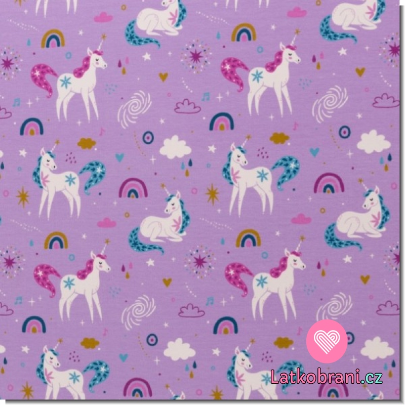 Úplet potlač rozprávkoví jednorožcovi na fialkovej
