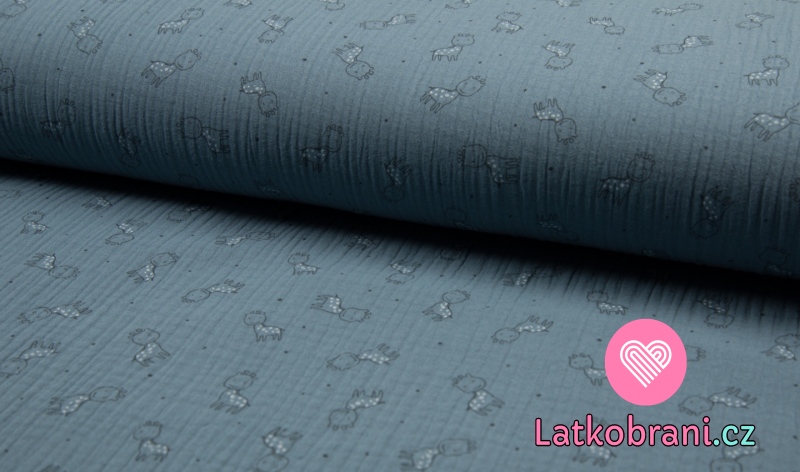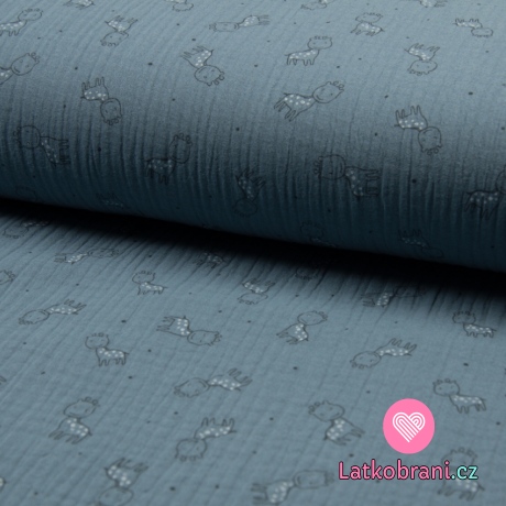 Dvojitá gázovina / mušelín potlač žirafka na zaprášené tmavšej modrej