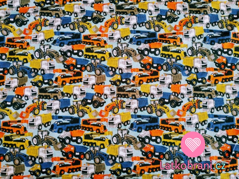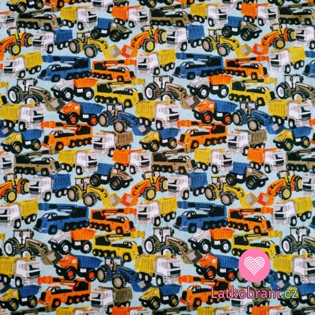 Úplet potlač žeriavy, nakladače a nákladné autá na modrej