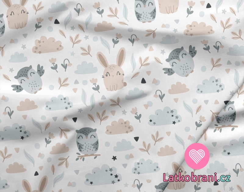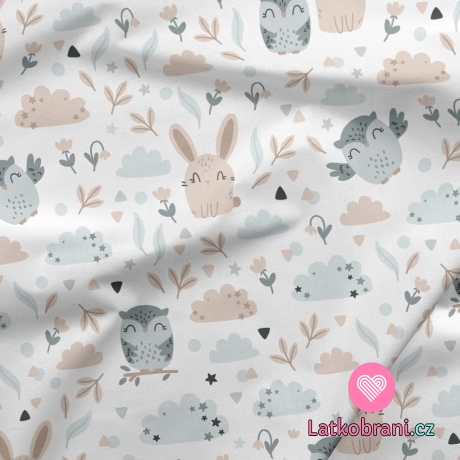 Teplákovina potlač malej sovy a zajačiky na smotanové