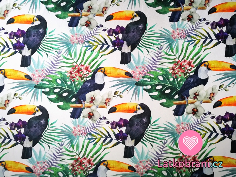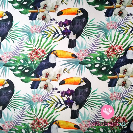 Úplet potlač tukany medzi exotickými kvetinami