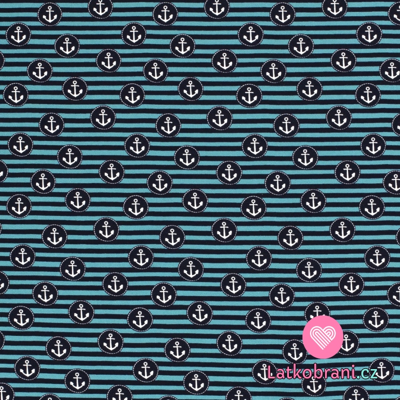 Úplet potlač kotvičky v medailónika na modrých prúžkoch