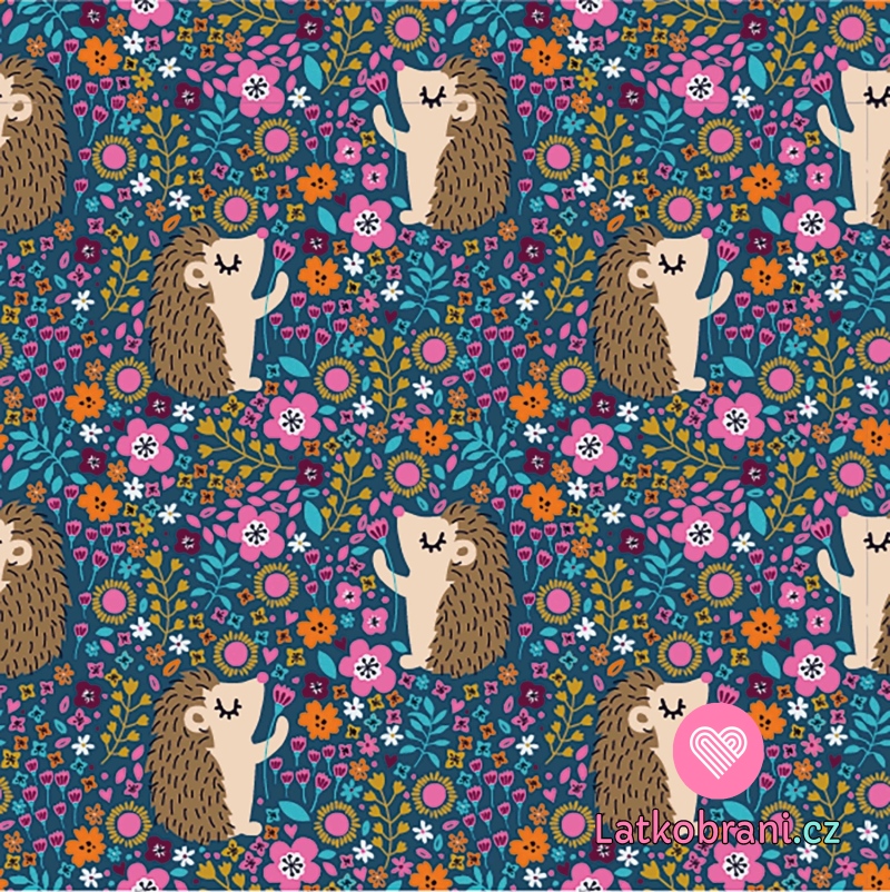 Úplet potlač ježečci medzi kvietky na námorníckej modrej
