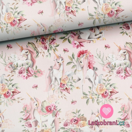 Teplákovina potlač jednorožce v ružovej záhrade
