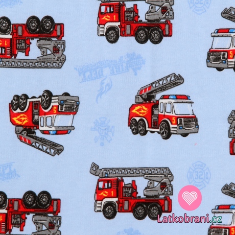 Bavlnený úplet hasičské auto na modrej