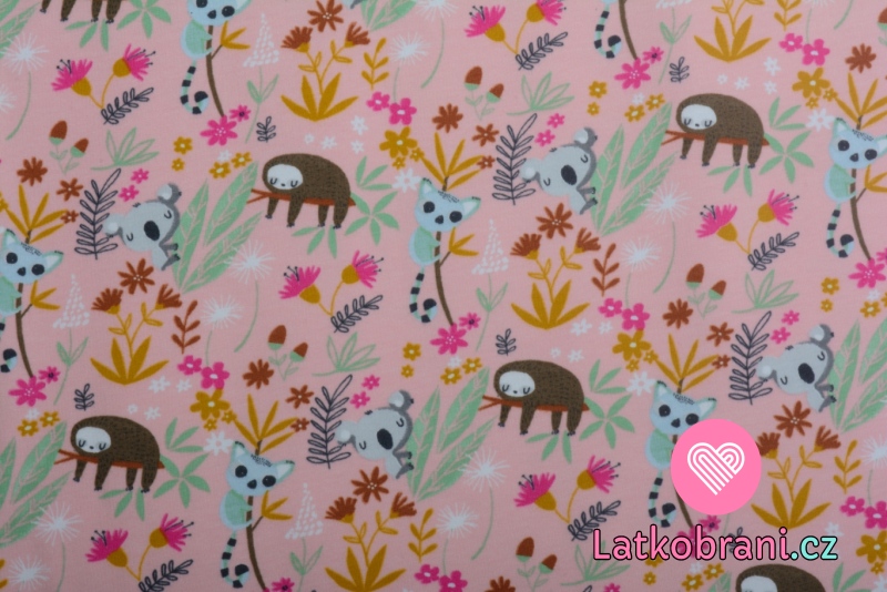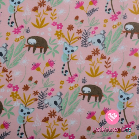 Teplákovina počesaná potlač lenošící zvieratka vo vetvách na ružové, BIO