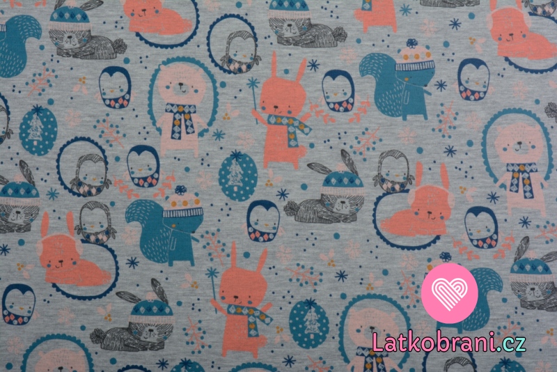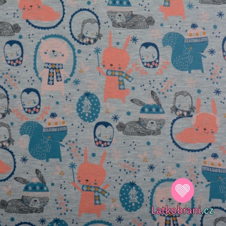 Teplákovina potlač zvieratká v zime na šedom melé