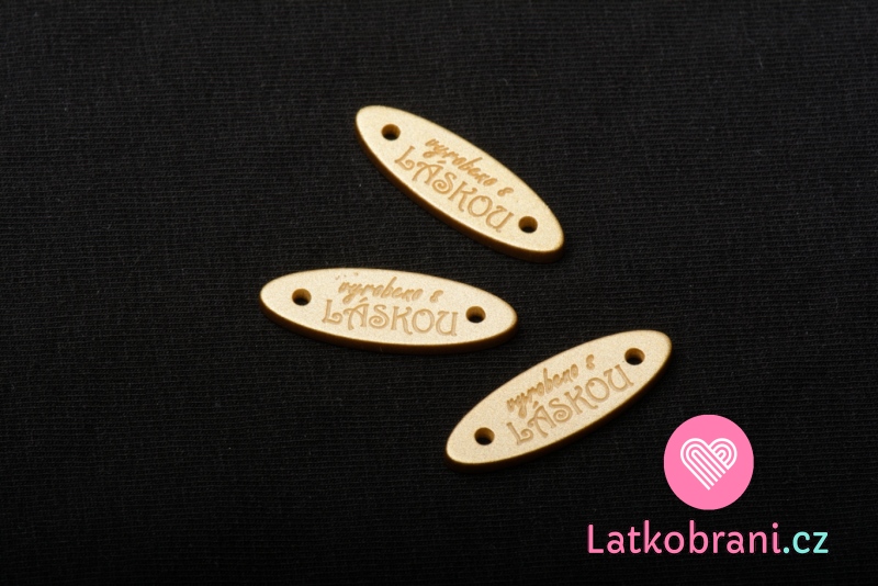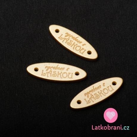 Štítok na oblečenie polyesterový zlatý "Vyrobené s láskou"