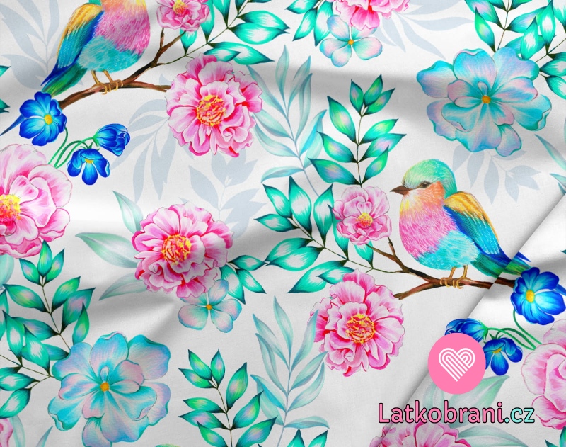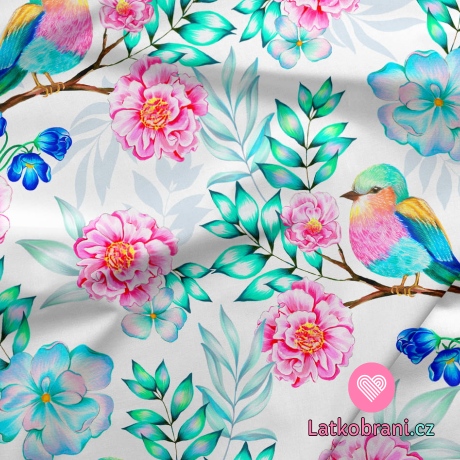 Softshell potlač vtáčik speváčik medzi farebnými kvetmi na biele