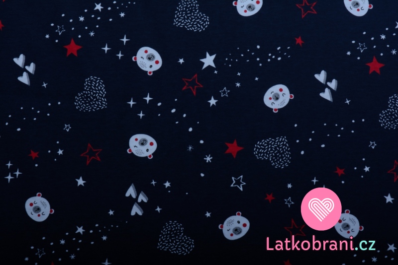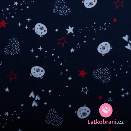 Bavlnený úplet medvedík a srdce vo hviezdach na temne modrej