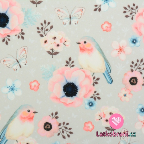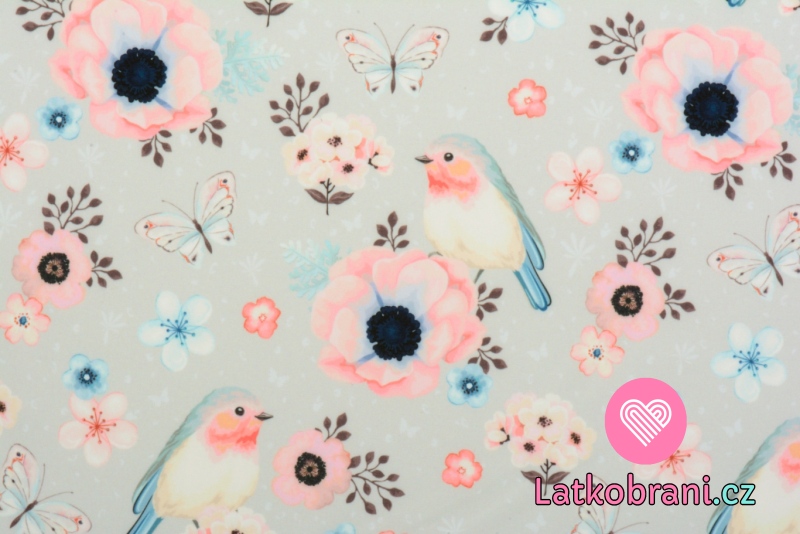 Softshell potlač vtáčiky medzi motýliky a kvety na šedej