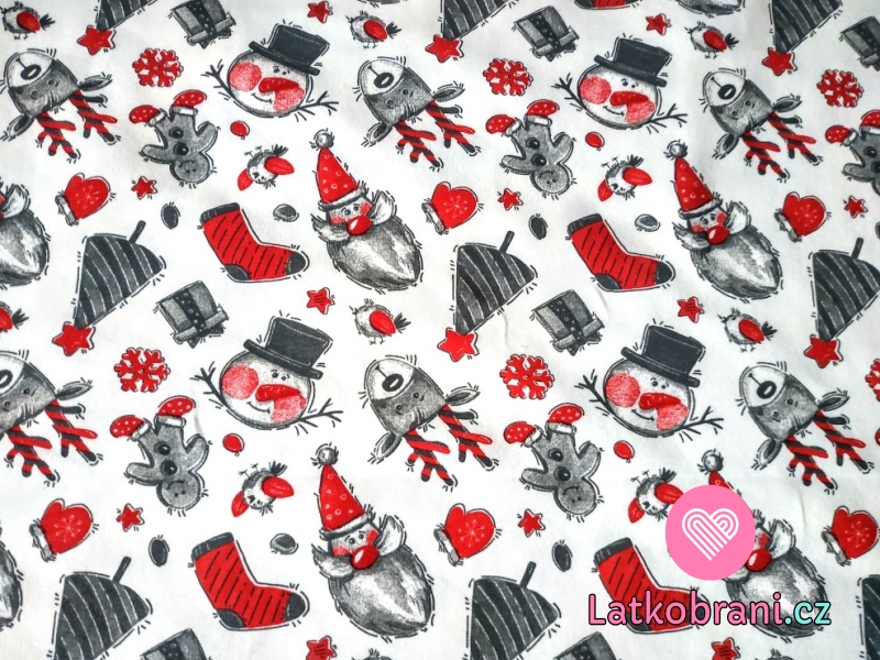 Úplet potlač vianočné soby, snehuliaci, perníčky a stromčeky na bielej