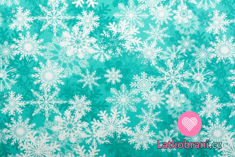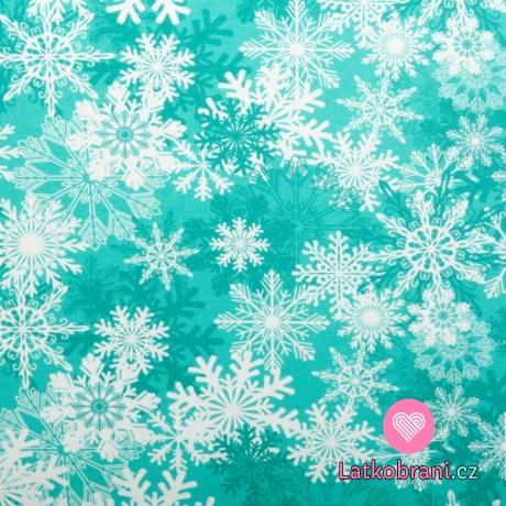 Úplet potlač biele snehové vločky na zelenej