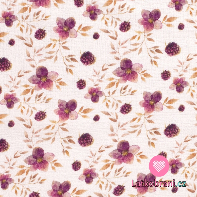 Dvojitá gázovina / mušelín černice s kvetmi na bielej