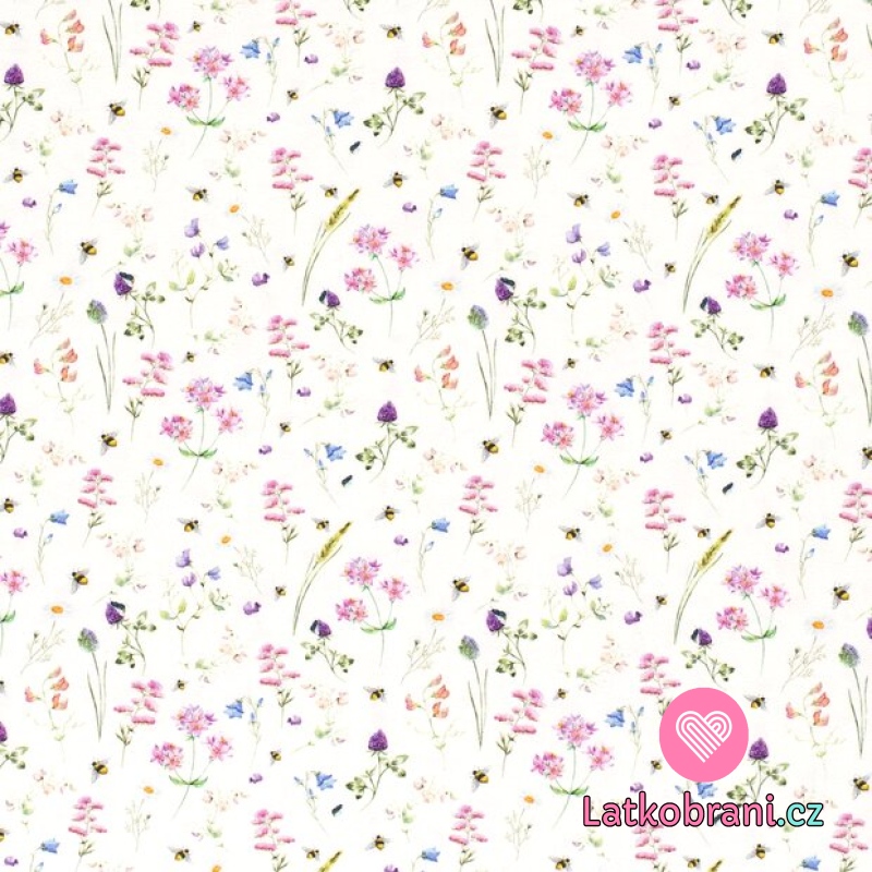 Úplet potlač lúčne kvety s poletujúce včielkou na biele