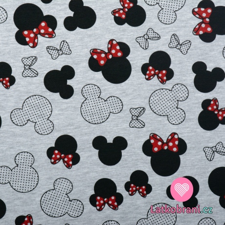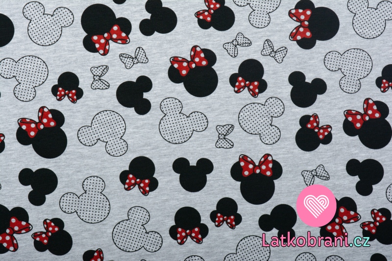 Teplákovina potlač hlava myšky s červenou mašľou na svetle šedom melé