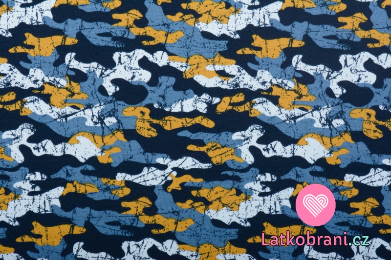 Teplákovina potlač maskáč modrý v horčicovej