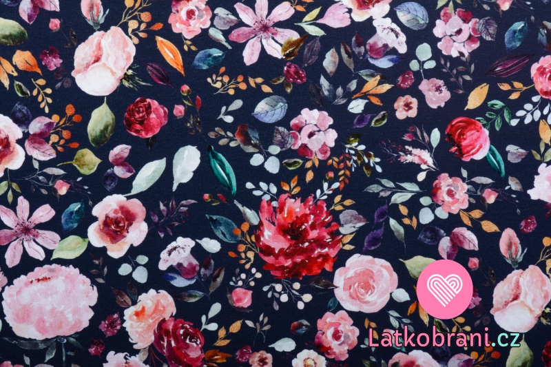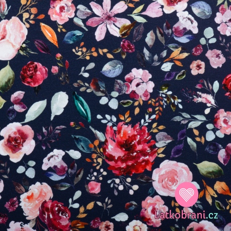 Úplet potlač maľované kvety na námorníckej modrej, BIO