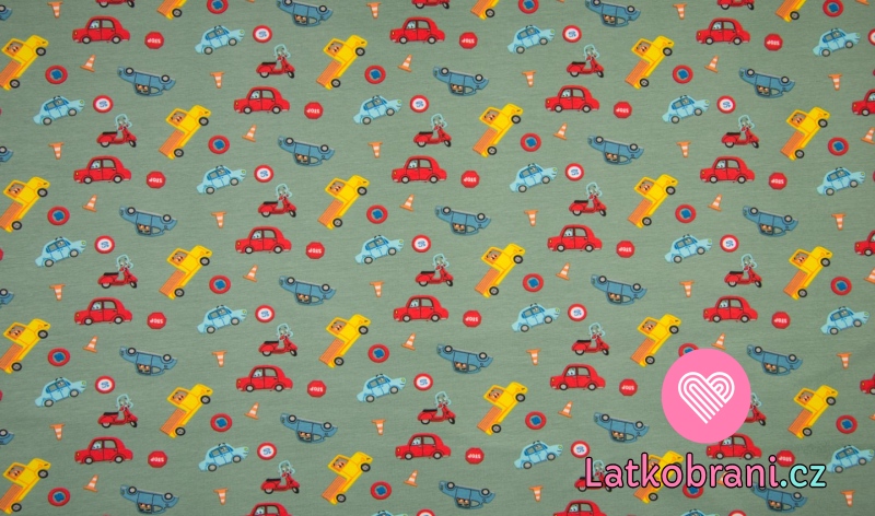 Úplet potlač cestné vozidlá medzi dopravnými značkami na zaprášené zelenej