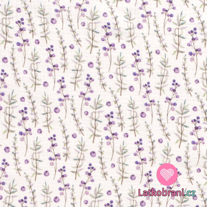 Dvojitá gázovina / mušelín čučoriedky medzi čučoriedkami na bielej