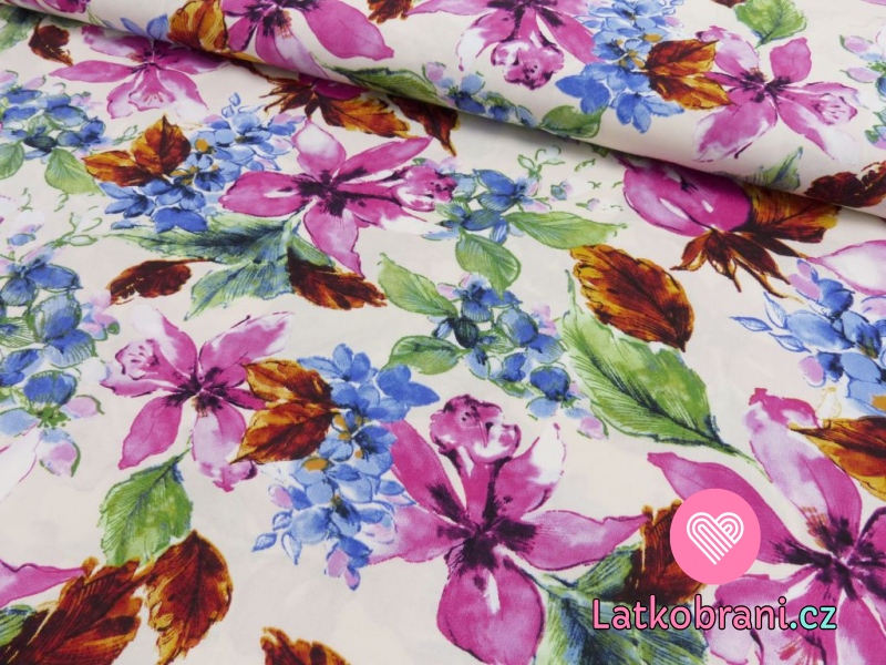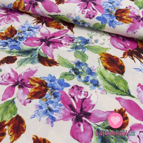 Viskóza potlač farebné kvety medzi lístočky na biele