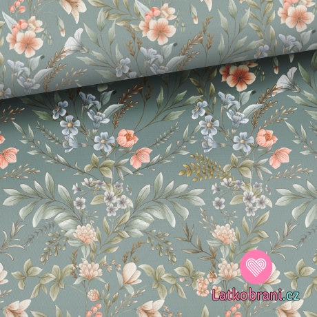 Teplákovina potlač kvetinky s vetvičkou na zelenej