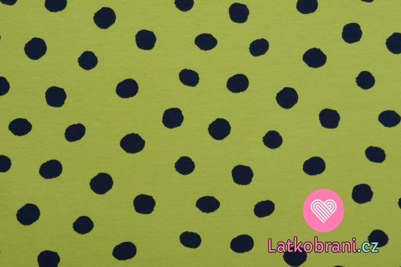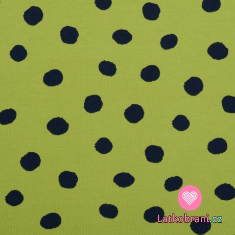 Teplákovina potlač nepravidelné tmavo modré bodky na zelenej, BIO