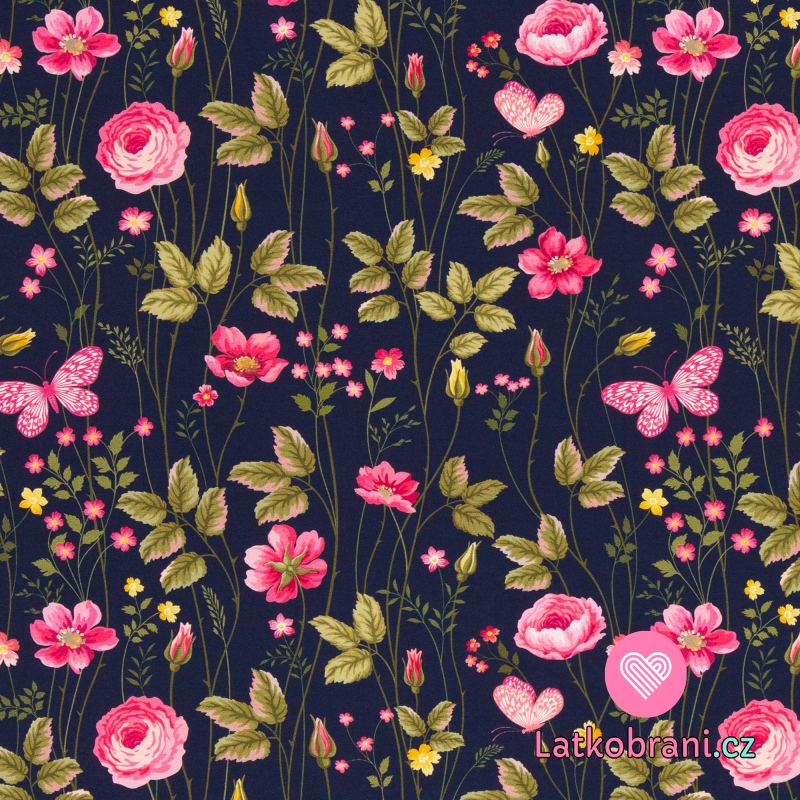 Úplet potlač rozkvitnutá ružová lúka na tmavo modré