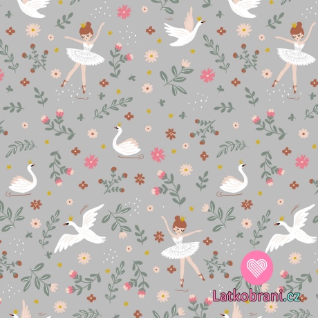 Teplákovina počesaná potlač tancujúce baletka s bielou labuťou na svetlo šedej, BIO