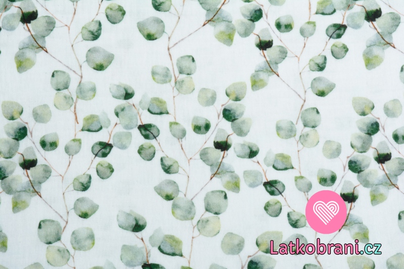 Dvojitá gázovina / mušelín eukalyptus na biele, BIO