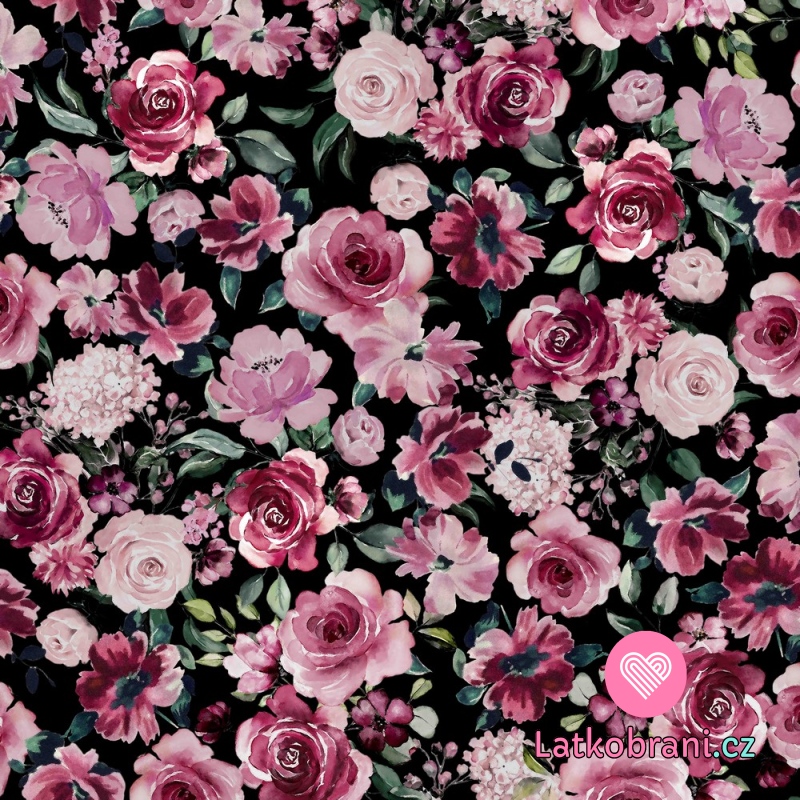 Teplákovina počesaná potlač rozkvitnuté ružové kvety na čiernej, BIO