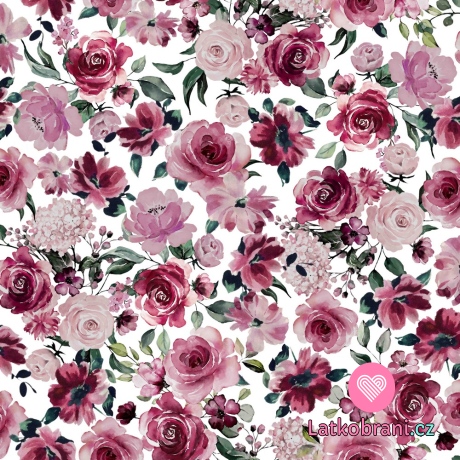 Teplákovina počesaná potlač rozkvitnuté ružové kvety na biele, BIO