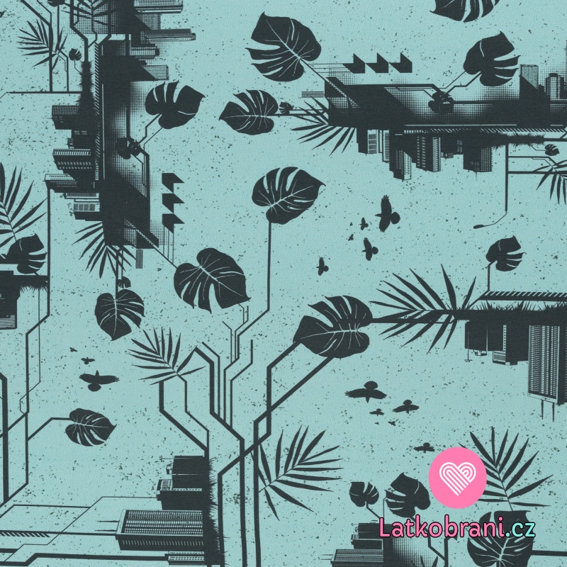 Úplet potlač moderná budova medzi listami na tyrkysové