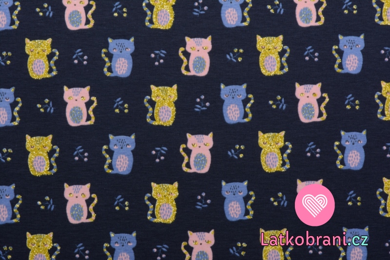 Úplet potlač trblietavé farebné mačičky na modrej navy