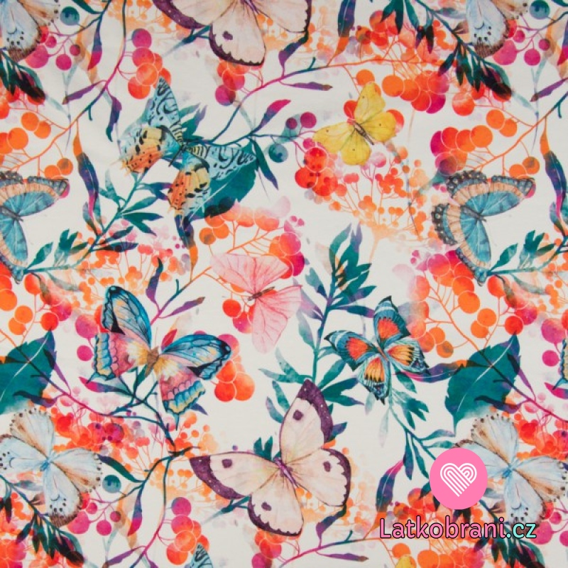 Teplákovina potlač pestrofarební motýle medzi vetvičkami