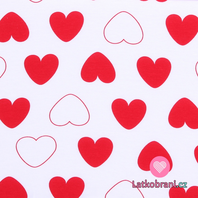 Bavlnený úplet potlač červené srdiečka na biele