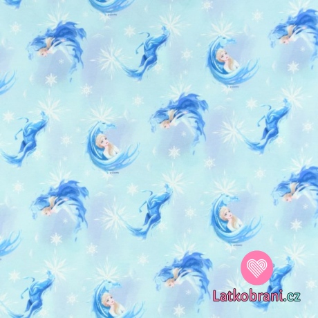 Teplákovina počesaná potlač Elsa a ľadový kôň medzi vločkami na modrej