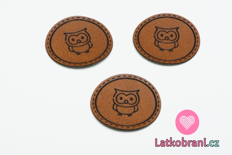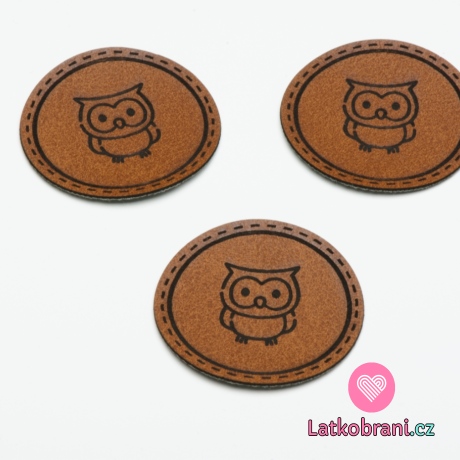 Štítok na oblečenie guľatý "sova", koženkový, hladký povrch