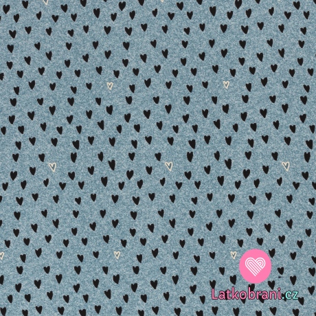 Teplákovina potlač čierna srdiečka na modrom podklade jeans efekt