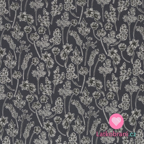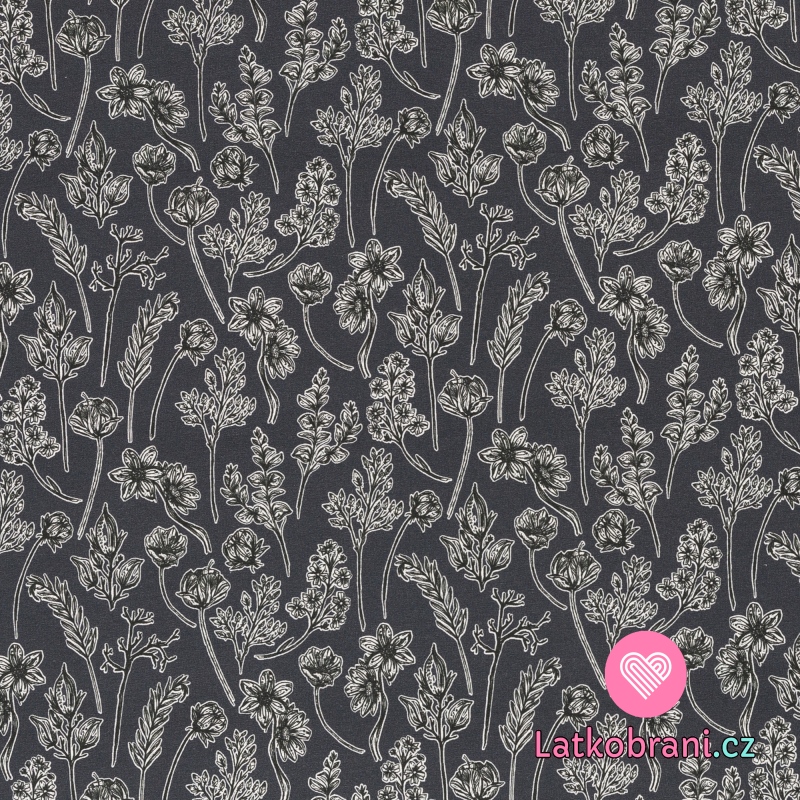Teplákovina s prímesou modalu potlač čiernobiela kvietky na šedej