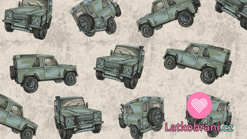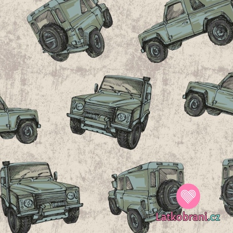 Teplákovina počesaná potlač zelený jeep na béžovej