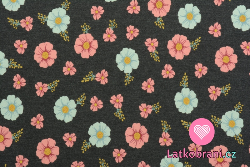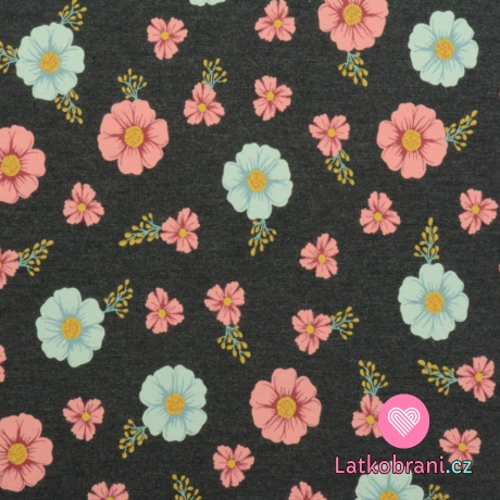 Teplákovina počesaná farebné kytičky na modrošedom melé