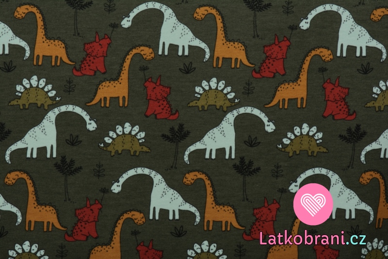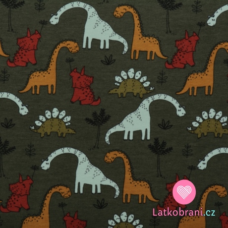 Teplákovina počesaná potlač roztomilí dinosaury na tmavo zelené, BIO